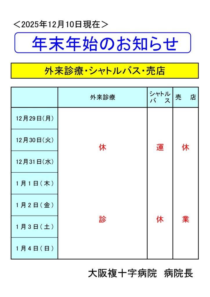 年末年始(12月29日~1月4日)の外来診療、シャトルバス運行、売店営業について