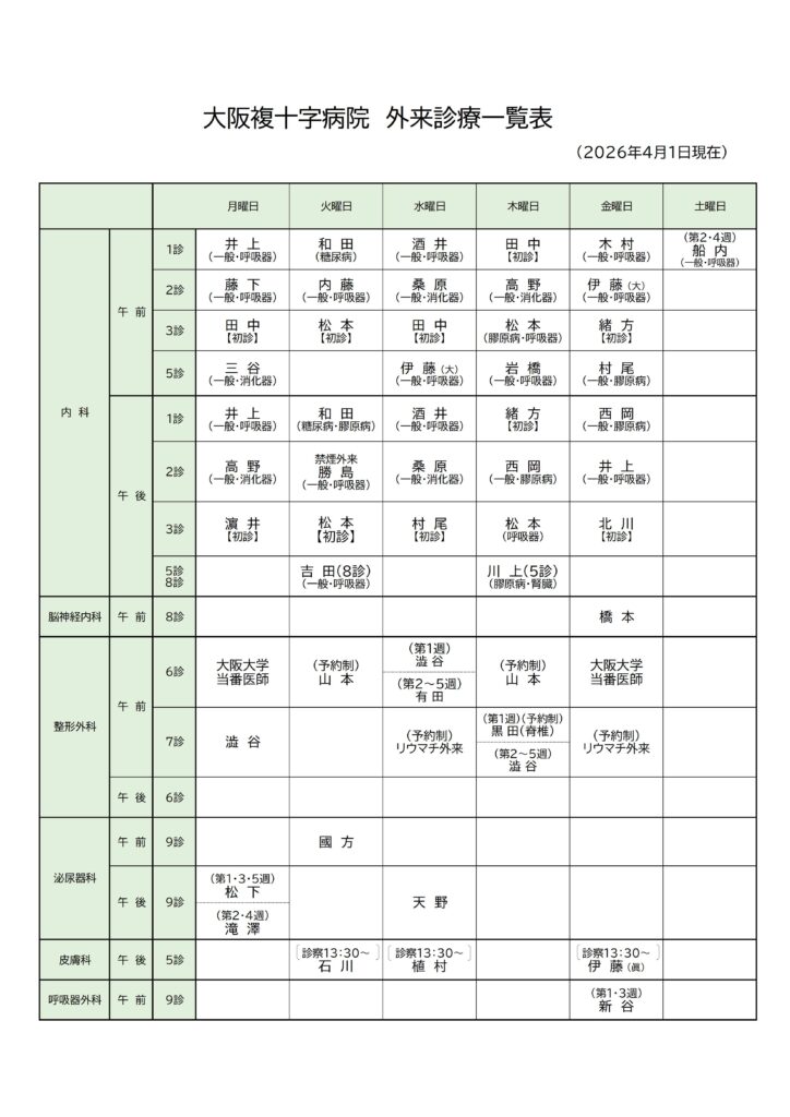 外来診療日程表を更新しました